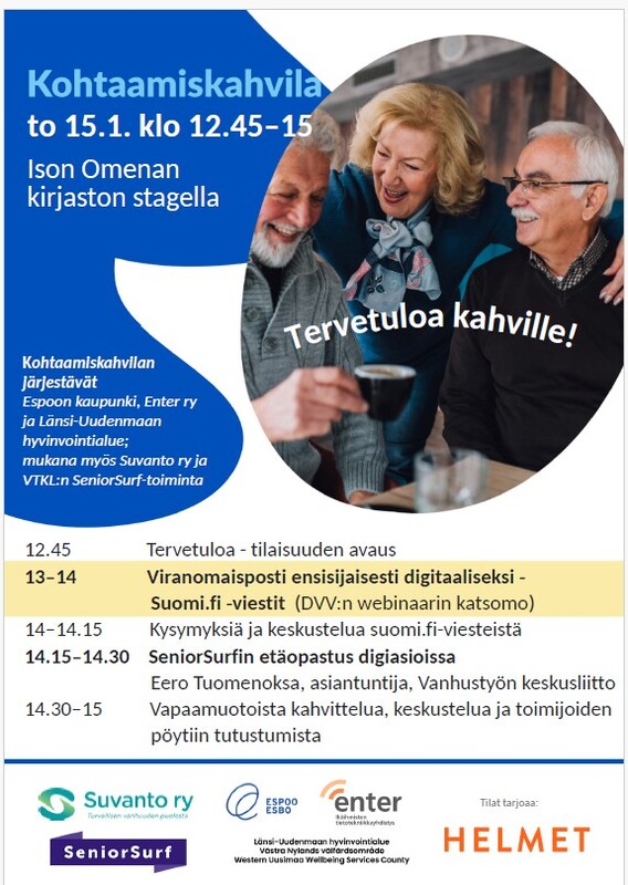 - 14.15–14.30 SeniorSurfin etäopastus digiasioissa Eero Tuomenoksa, asiantuntija, Vanhustyön keskusliitto
