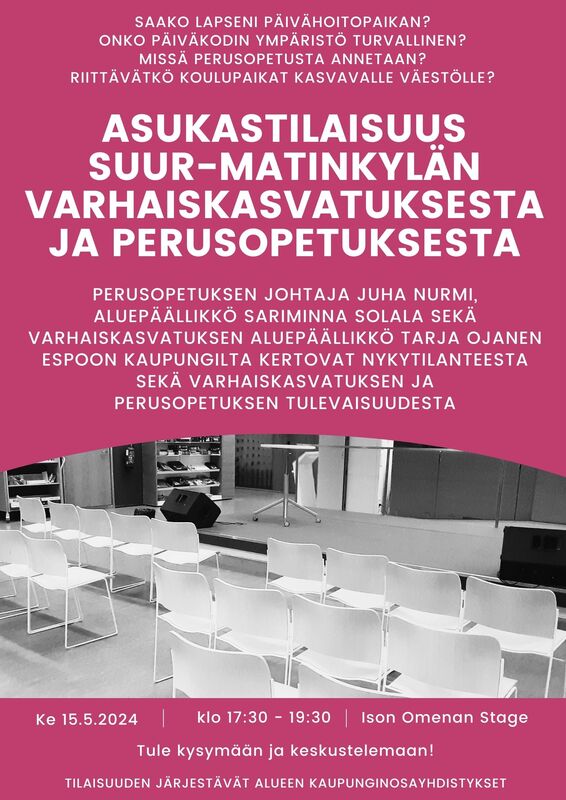 Tervetuloa varhaiskasvatuksen ja perusopetuksen keskustelutilaisuuteen 15 toukokuuta klo 17.30 Ison Omenan palvelutorille!