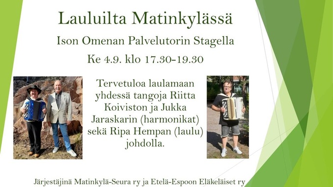 Matinkylä-Seura ry on mukana Matinkylän rannassa. Pelaamme mölkkyä, kerromme rantaraitin Nuottaniemen rakentamattomasta osasta, Miessaaren saamisesta virkistyskäyttöön ja Matinkylän uusista nettikaupunkipoluista.